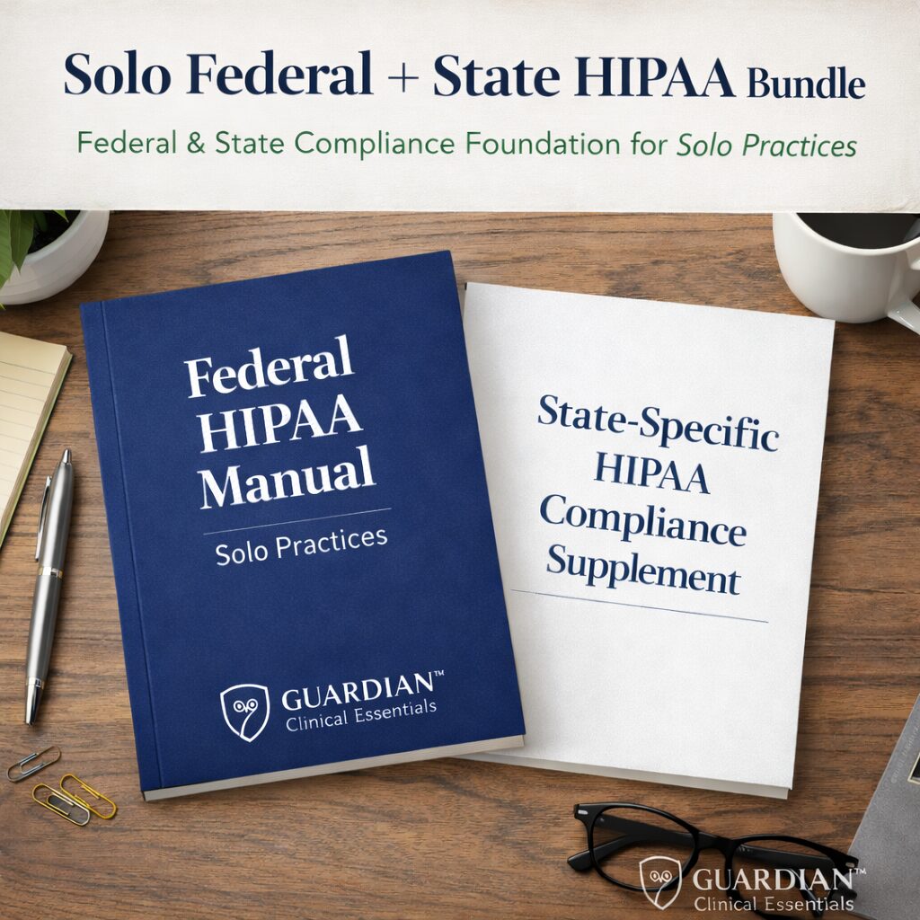 This bundle combines the two core components every solo practice needs to establish a defensible compliance foundation. Instead of purchasing pieces separately or trying to reconcile multiple resources, you receive a coordinated federal and state system designed to work together.